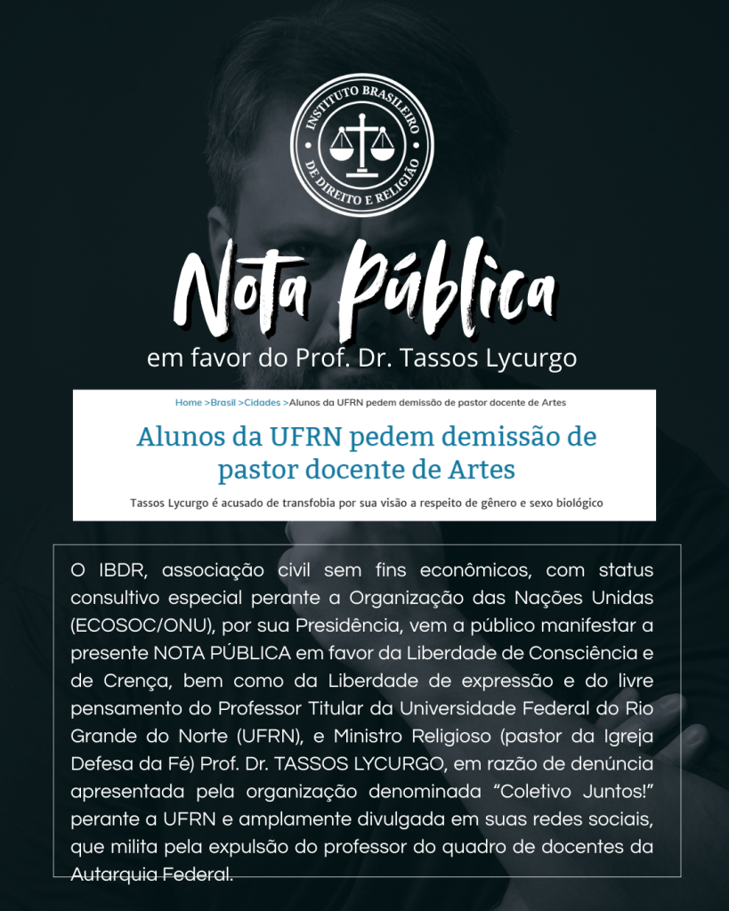 O INSTITUTO BRASILEIRO DE DIREITO E RELIGIÃO (IBDR), associação civil sem fins econômicos, com status consultivo especial perante a Organização das Nações Unidas (ECOSOC/ONU), por sua Presidência, vem a público manifestar a presente NOTA PÚBLICA em favor da Liberdade de Consciência e de Crença, bem como da Liberdade de expressão e do livre pensamento do Professor Titular da Universidade Federal do Rio Grande do Norte (UFRN), e Ministro Religioso (pastor da Igreja Defesa da Fé) Prof. Dr. TASSOS LYCURGO, em razão de denúncia apresentada pela organização denominada “Coletivo Juntos!” perante a UFRN e amplamente divulgada em suas redes sociais, que milita pela expulsão do professor do quadro de docentes da Autarquia Federal.