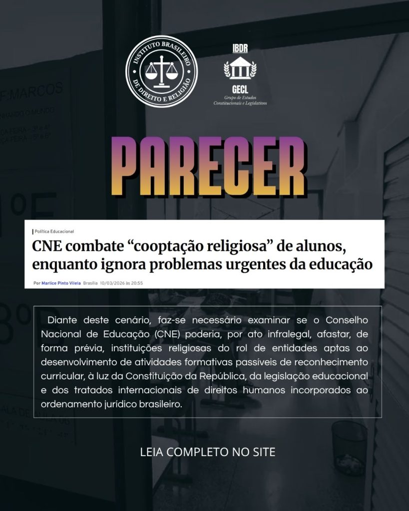 O Grupo de Estudos Constitucionais e Legislativos (GECL) do Instituto Brasileiro de Direito e Religião (IBDR), organização com status consultivo especial perante o Conselho Econômico e Social da Organização das Nações Unidas (ECOSOC/ONU) desde 29 de julho de 2025, vem, respeitosamente, por meio de seus membros e seu líder abaixo assinados, emitir parecer em face do Parecer CNE/CEB nº 1/2026 (Processo nº 23000.048617/2025-78), aprovado pela Câmara de Educação Básica do Conselho Nacional de Educação em 29 de janeiro de 2026, que estabelece diretrizes para o credenciamento de instituições aptas a oferecer atividades de trabalho remunerado ou voluntário para estudantes de Ensino Médio.