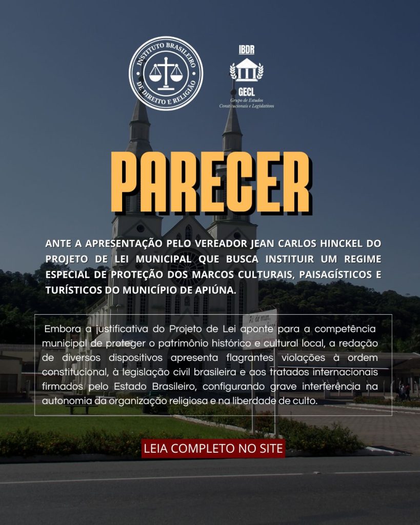 O Grupo de Estudos Constitucionais e Legislativos (GECL) do Instituto Brasileiro de Direito e Religião (IBDR) – organização com status consultivo especial perante o Conselho Econômico e Social da Organização das Nações Unidas (ECOSOC/ONU) desde 29 de julho de 2025 – vem, respeitosamente, por meio de sua líder e pelo Presidente do IBDR abaixo assinados, ante a apresentação pelo vereador Jean Carlos Hinckel do Projeto de Lei Municipal que busca instituir um regime especial de proteção dos marcos culturais, paisagísticos e turísticos do Município de Apiúna, abrangendo o conjunto urbano da Igreja Matriz Sant’Ana e Praça da Matriz, bem como o Morro Dom Bosco e sua paisagem associada, e dá outras providências, emitir PARECER, com fundamento no artigo 5º, incisos VI, VII e VIII, e artigo 19, inciso I, da Constituição da República Federativa do Brasil de 1988 e Acordo Brasil Santa-Sé.