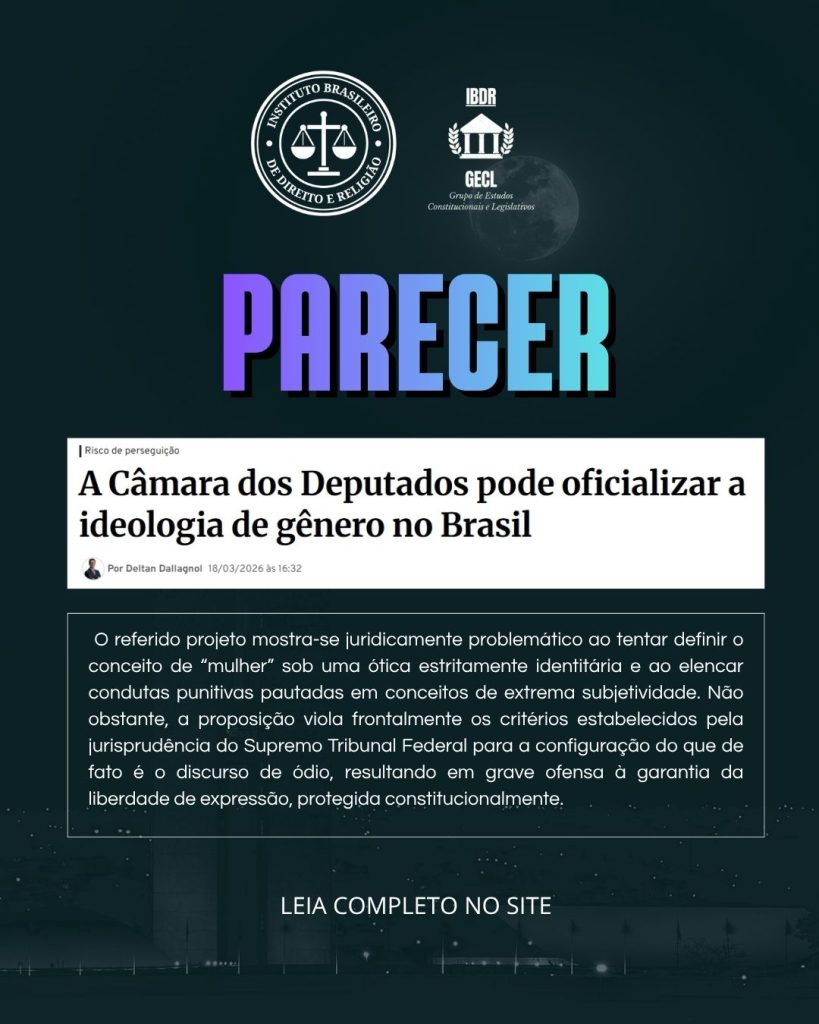 O Grupo de Estudos Constitucionais e Legislativos (GECL) do Instituto Brasileiro de Direito e Religião (IBDR) _ organização com status consultivo especial perante o Conselho Econômico e Social da Organização das Nações Unidas (ECOSOC/ONU) desde 29 de julho de 2025 _ vem, respeitosamente, por meio de seus membros e seu líder abaixo assinados, ante o Projeto de Lei nº 6194/2025 (popularmente conhecido como PL da Misoginia), de autoria da Deputada Ana Pimentel, emitir PARECER, com fundamento no artigo 5º, incisos VI, VII e VIII, e artigo 19, inciso I, da Constituição da República Federativa do Brasil de 1988.